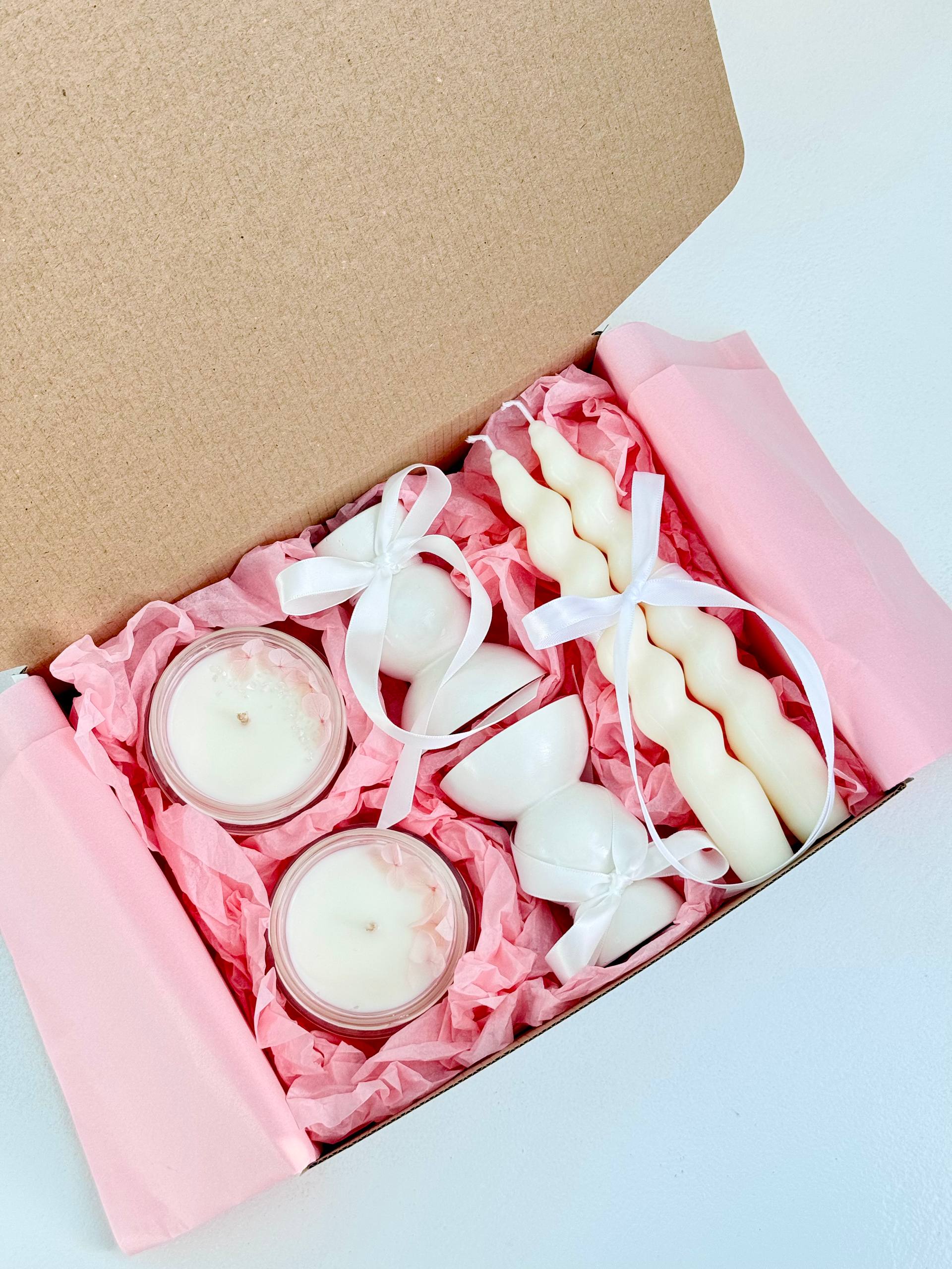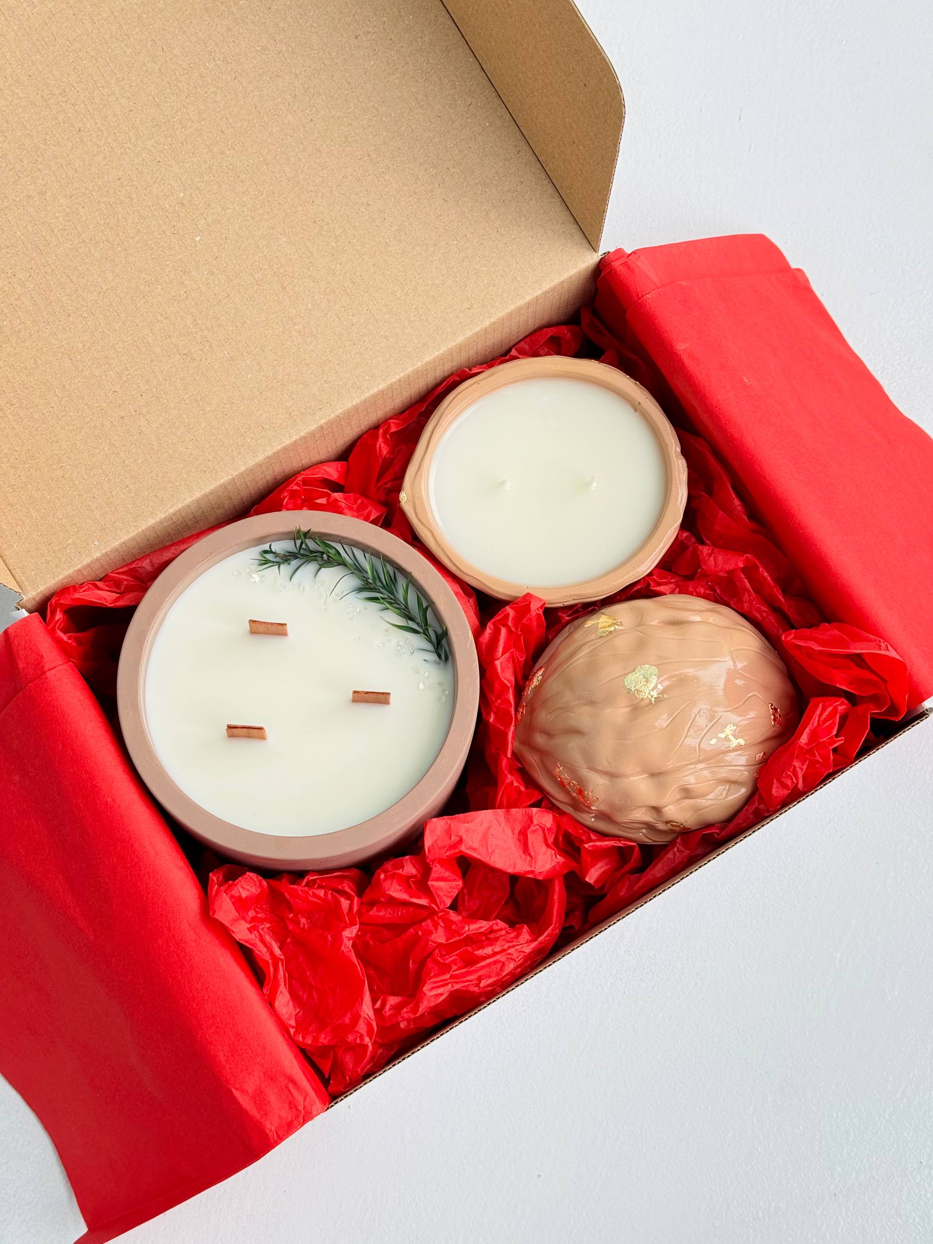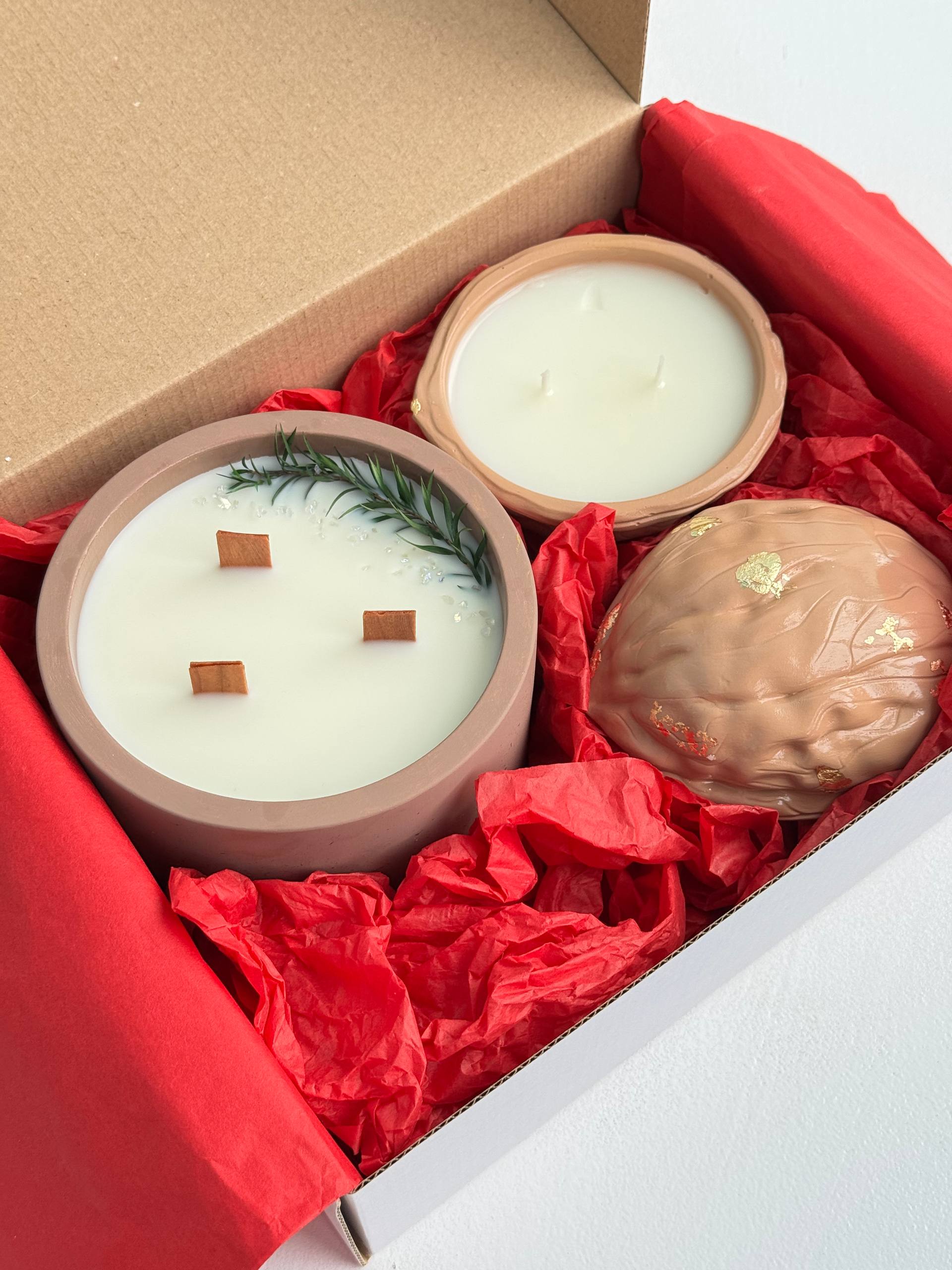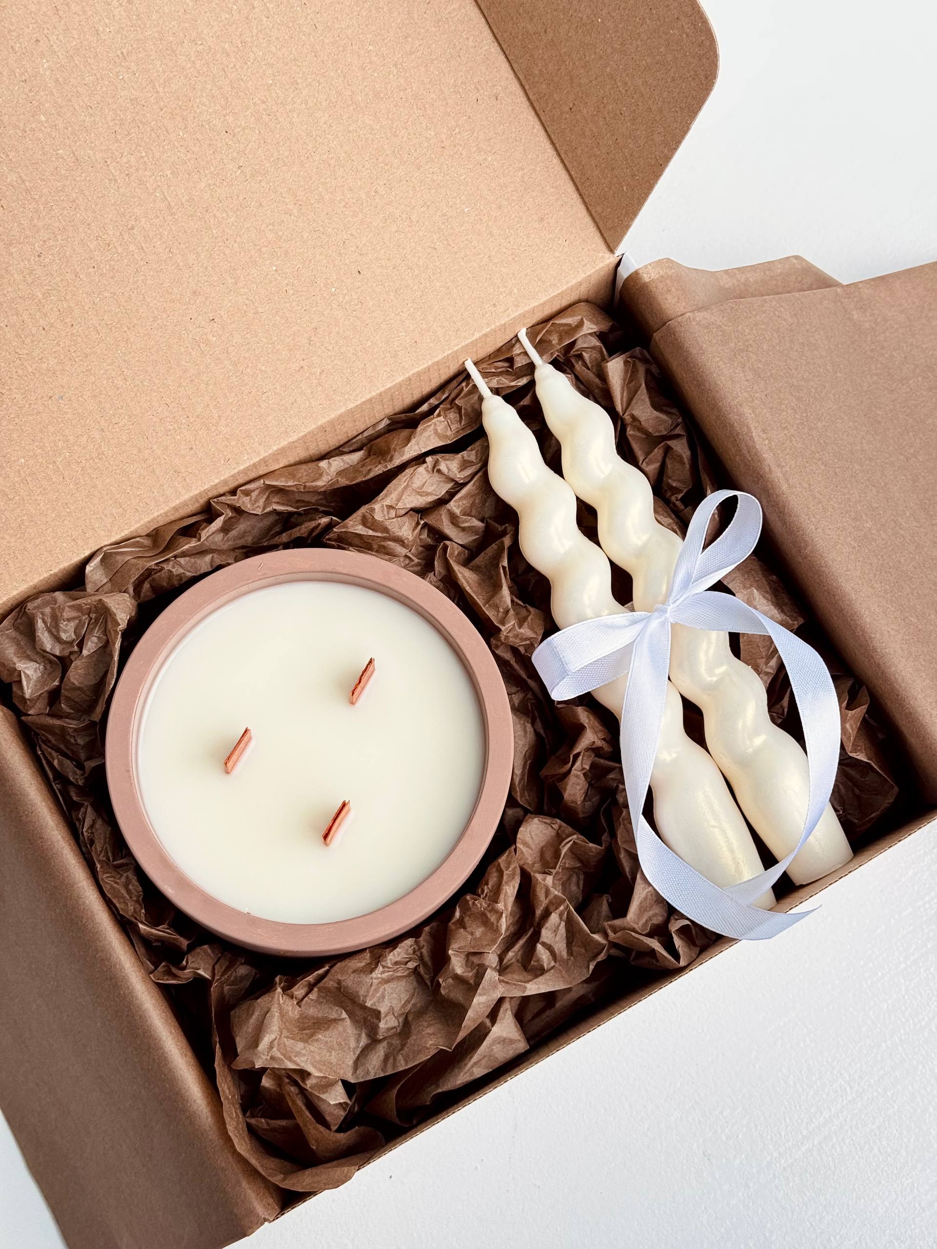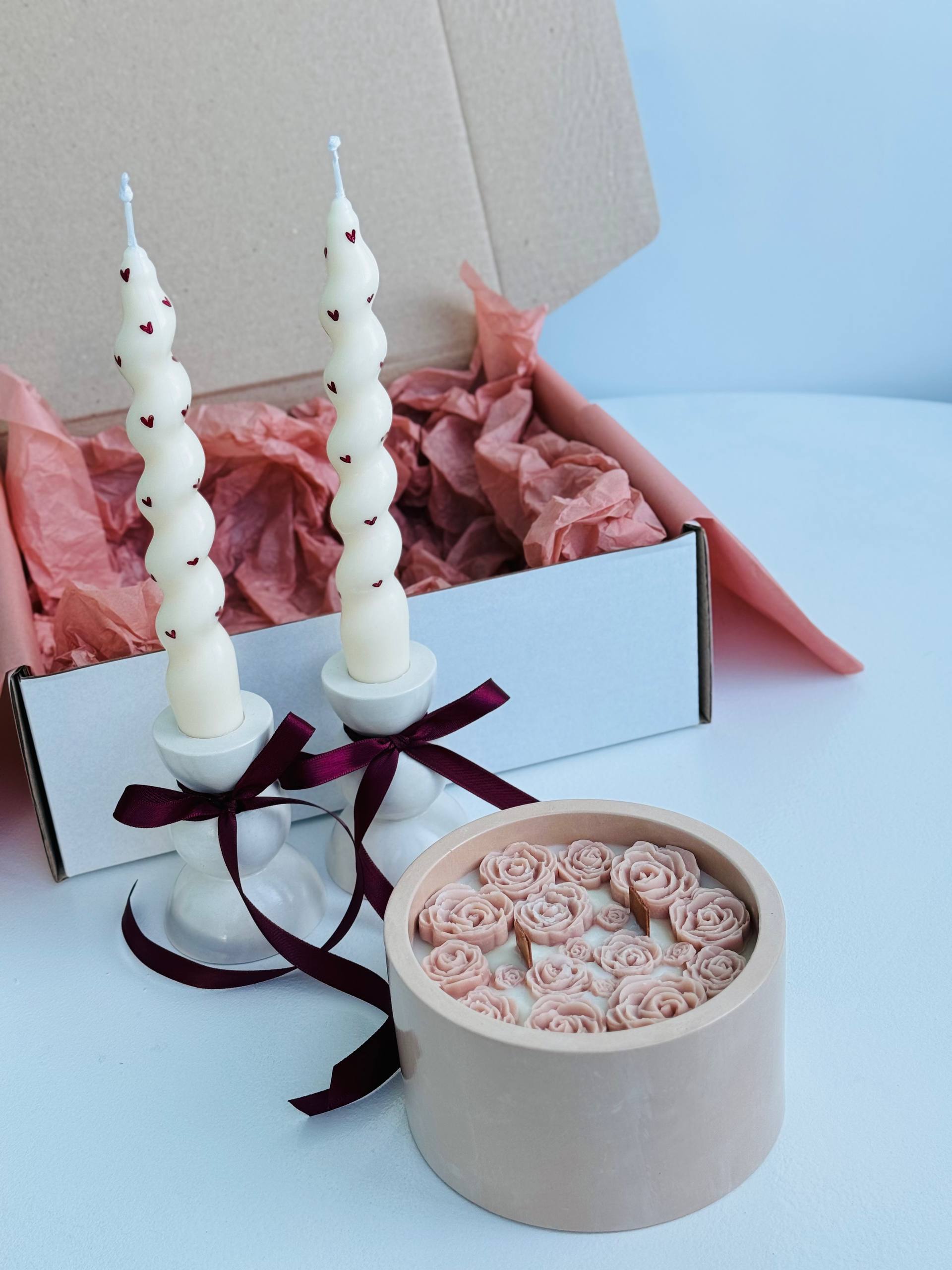 Două lumânări în sticlă (cu capac) 100 g Stative petru lumânări (2 bucăți) Lumânări spirală (2 bucăți) - 18 cm