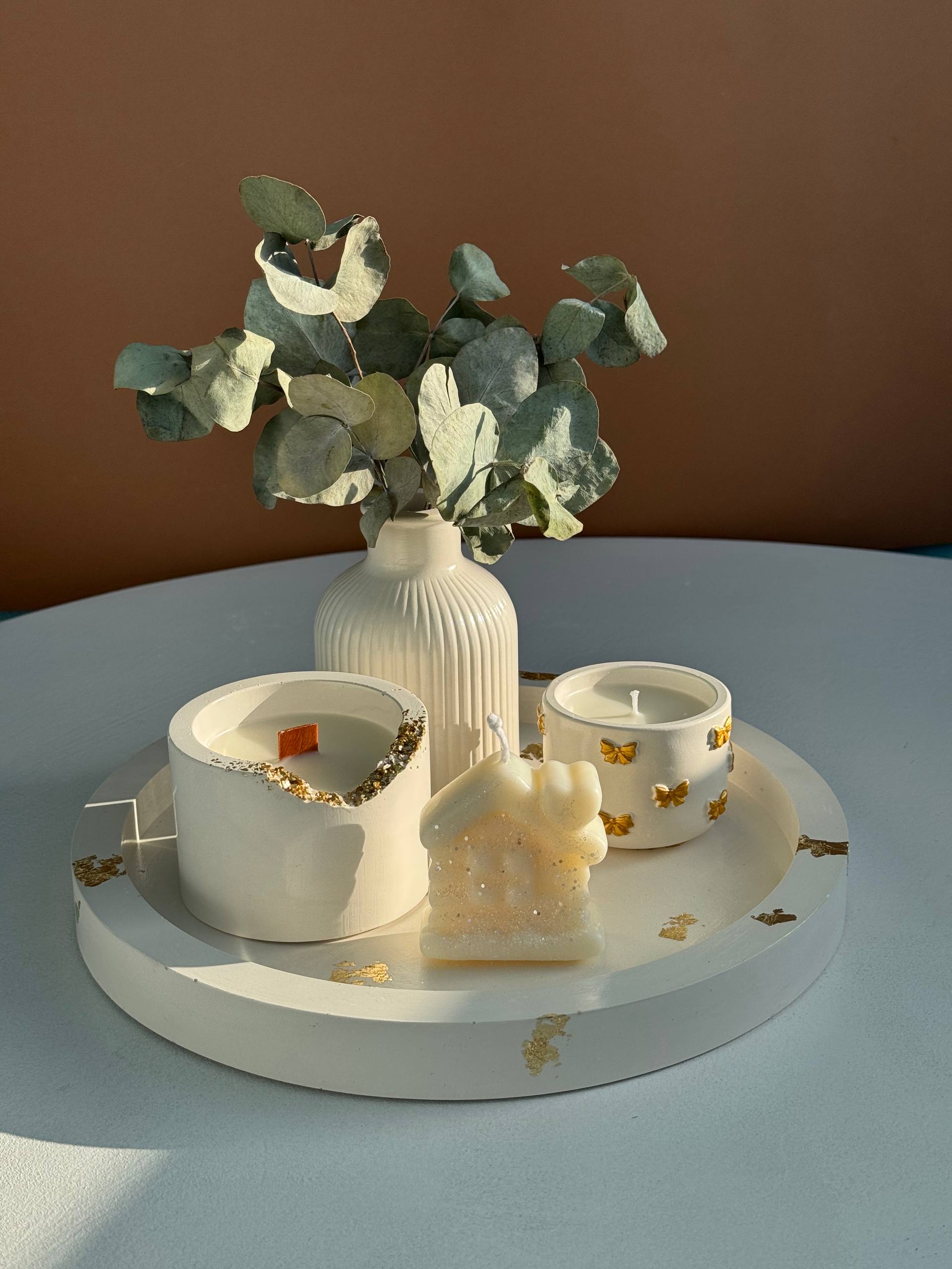 Lumânare 100 g Lumânare cu fundițe 60 g Lumânare căsuță 40 g Vază (Eucaliptul nu este inclus) Platou mare cu detalii aurii